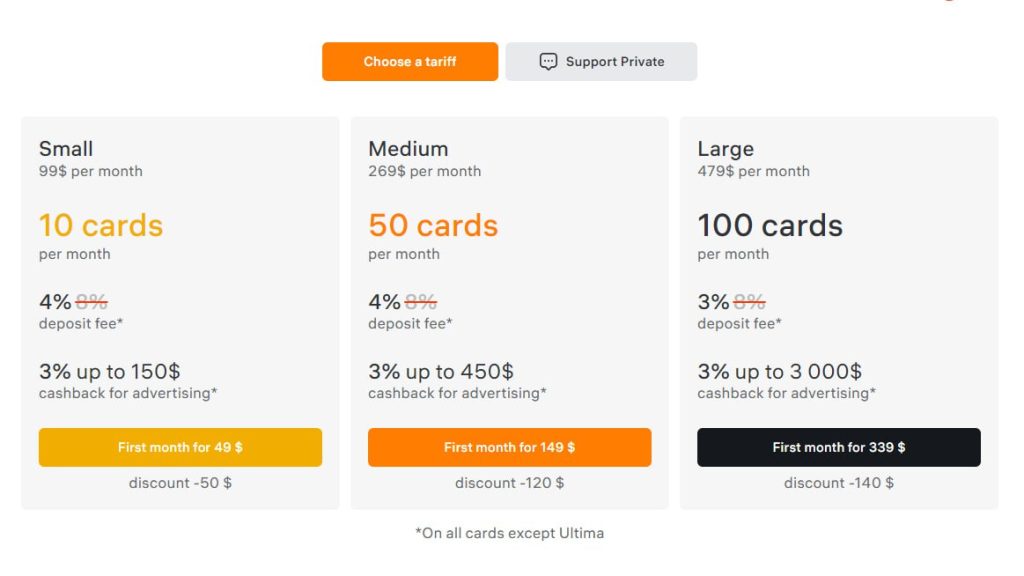 ¿Por qué esta oferta es más beneficiosa que el antiguo programa privado? En primer lugar, el nuevo PRIVATE es accesible para todos los usuarios sin necesidad de confirmar su facturación mensual. En segundo lugar, si te fijas bien, el importe del reembolso es igual a las comisiones de recarga en la mayoría de los niveles de precios. Lo que no solo facilita su análisis financiero, sino que maximiza el ROI en todas las campañas publicitarias que ejecuta entre un 10 y un 30%. Y por último, pero no menos importante, obtienes acceso a todos los 40+ tipos de tarjetas, acceso a API y más.